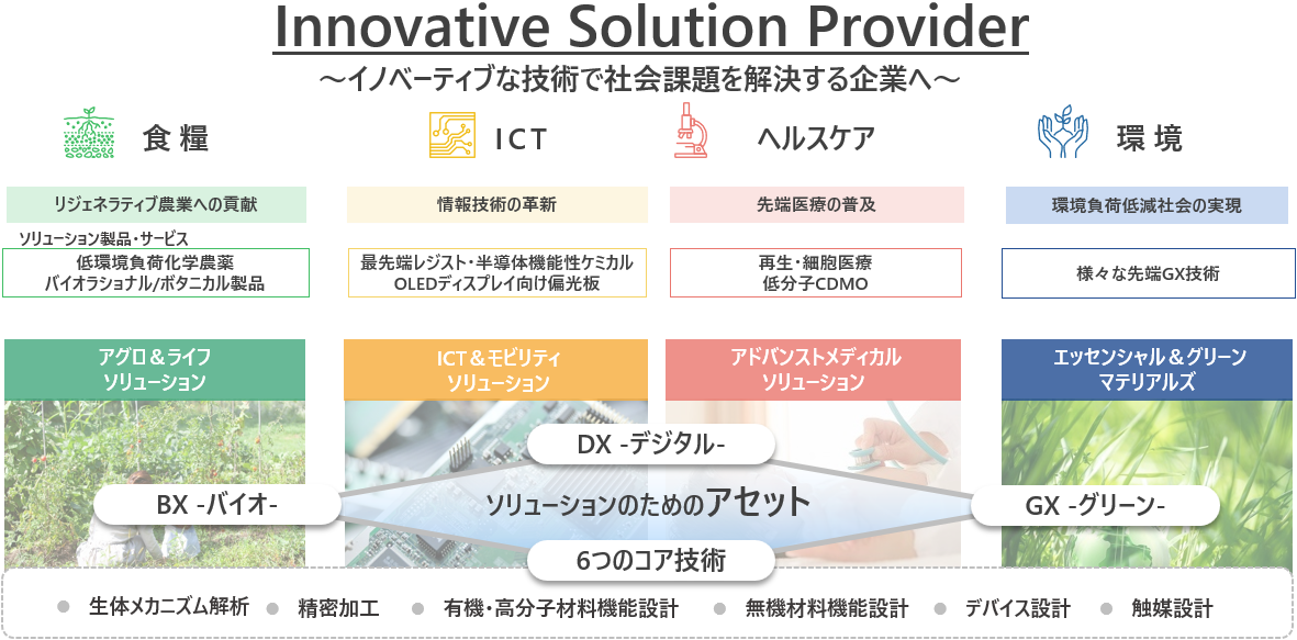 この目指す企業像に向け、当社が強みを持つ技術や事業のアセットから、取り組むべき社会課題を「食糧」「ICT」「ヘルスケア」「環境」に定めるとともに、これらの4つの課題に対応して事業部門を再編しました。100年以上の歴史の中で培った6つのコア技術、そしてそこから生まれる3つのX(GX・DX・BX)を切り口とした重要アセットを活用することで、革新的なソリューションを次々と生み出し、広く社会へ提供していきます。